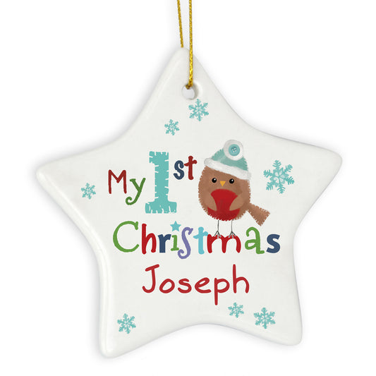 Personalised Felt Stitch Robin 'My 1st Christmas' Ceramic Star Decoration