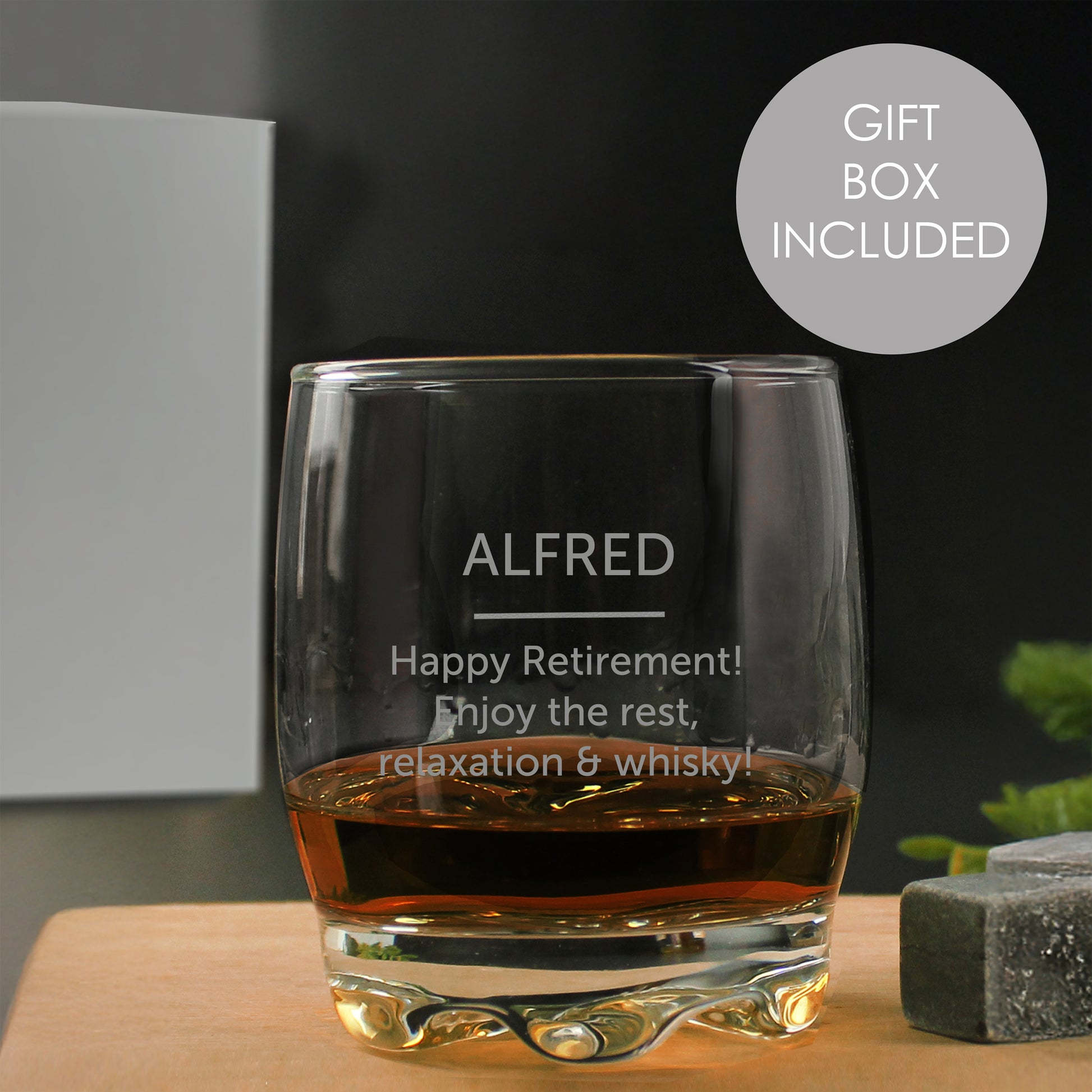 Personalise this whisky glass with a name or date up to 12 characters long and a message of 3 lines with up to 20 characters per line beneath the line.