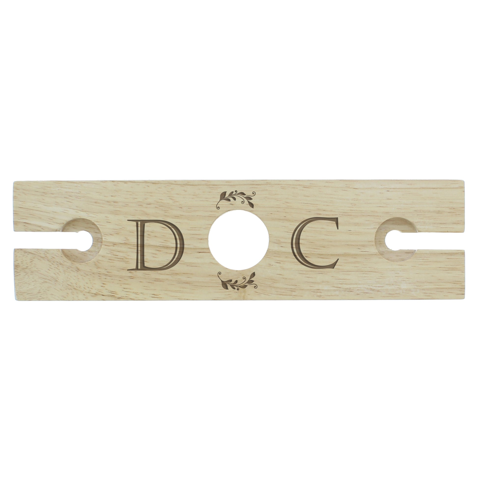 Personalise this bottle and wine glasses holder with 2 initials 1 either side of the circle.