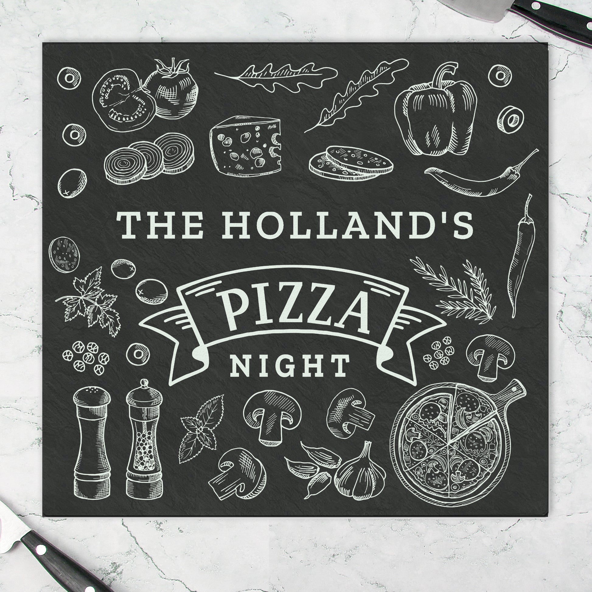 You can personalise this pizza design glass chopping board with any message up to 1 line of text with 20 characters available per line.