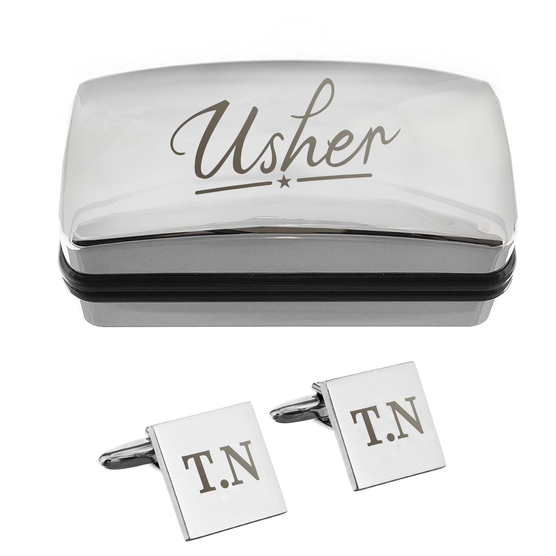 The cufflinks come beautifully presented in a sleek chrome-effect box, with "Usher" engraved on the lid, a lasting reminder of their special role in your big day.